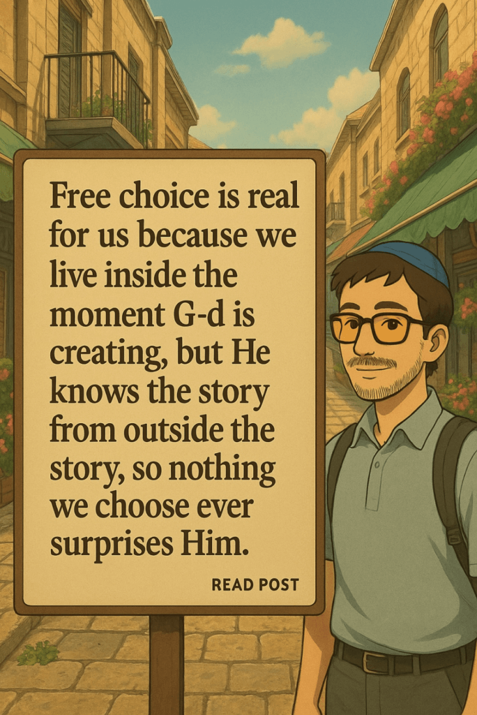 G-d’s knowledge isn’t like human knowledge. We learn about things outside of us. G-d’s knowledge is the thing. His knowing creates it. So when you make a choice, you’re not surprising Him. You’re living inside the very reality His knowing brings into being. You experience real choice. He experiences nothing new.