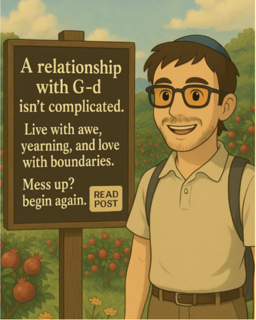 “A relationship with G-d isn’t complicated. Life with awe, yearning and love with boundaries. Mess up? Begin again. “